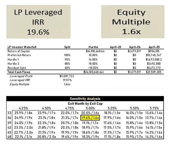 The project is projected to exit at a 5 cap in 36 months. The sensitivity table shows various scenarios, demonstrating that even in the worst-case scenario with a 5.75 cap rate at 33 months, the equity multiple remains at 1.4 due to an extra year of distributions. Overall, the project has been conservatively underwritten to ensure that even in adverse market conditions, investors remain well-positioned for returns.